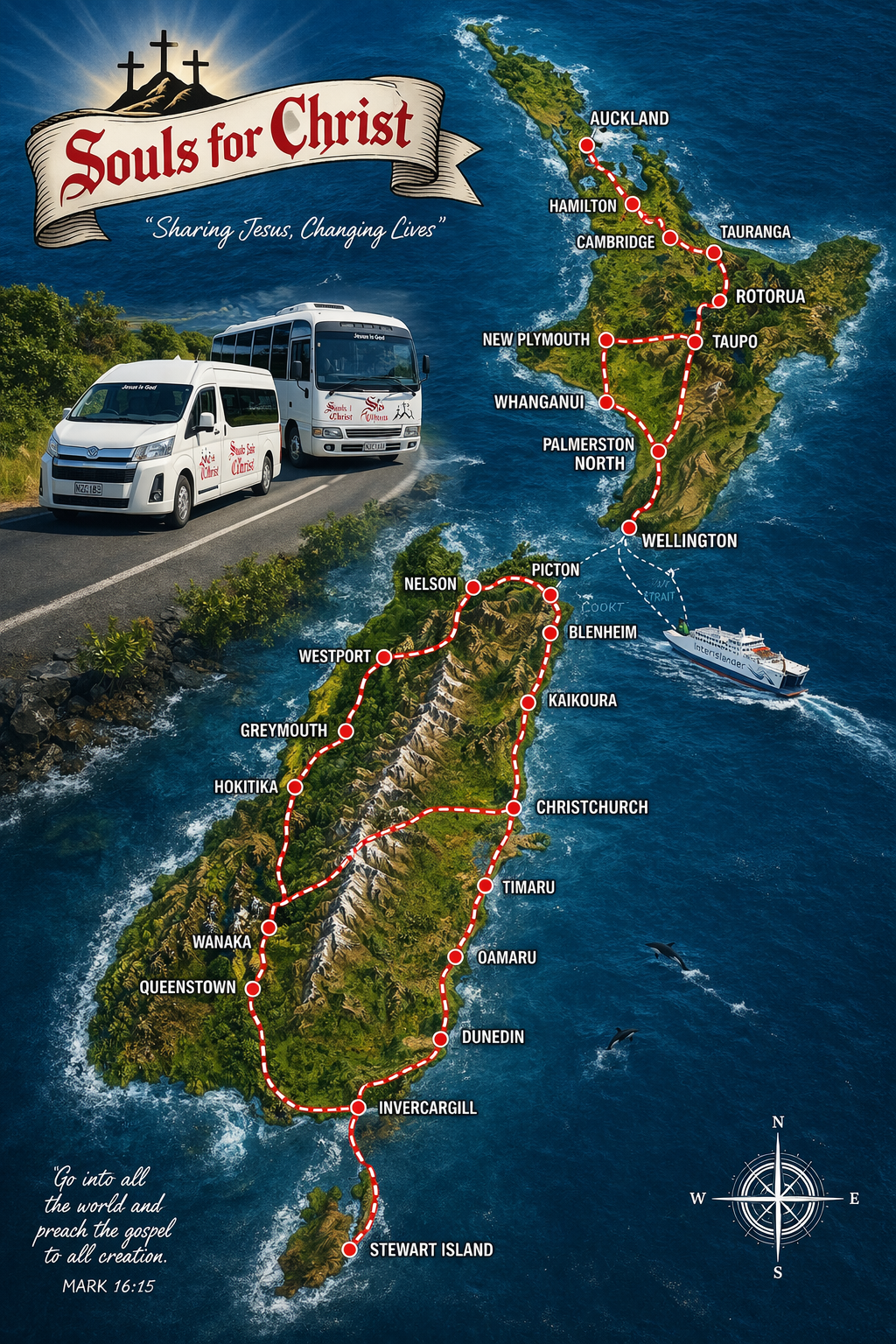 Thank You Father God, for connecting us with all our family in Christ all around New Zealand. Thank You for the many blessings You gifted us in places to park the buses, outreach labourers, fellowships and Your love that poured out to us all. You showed us the way.