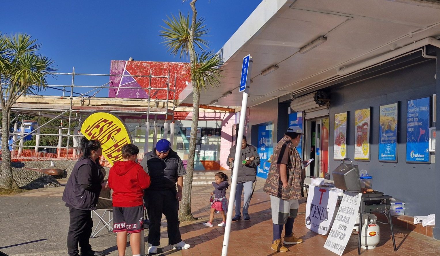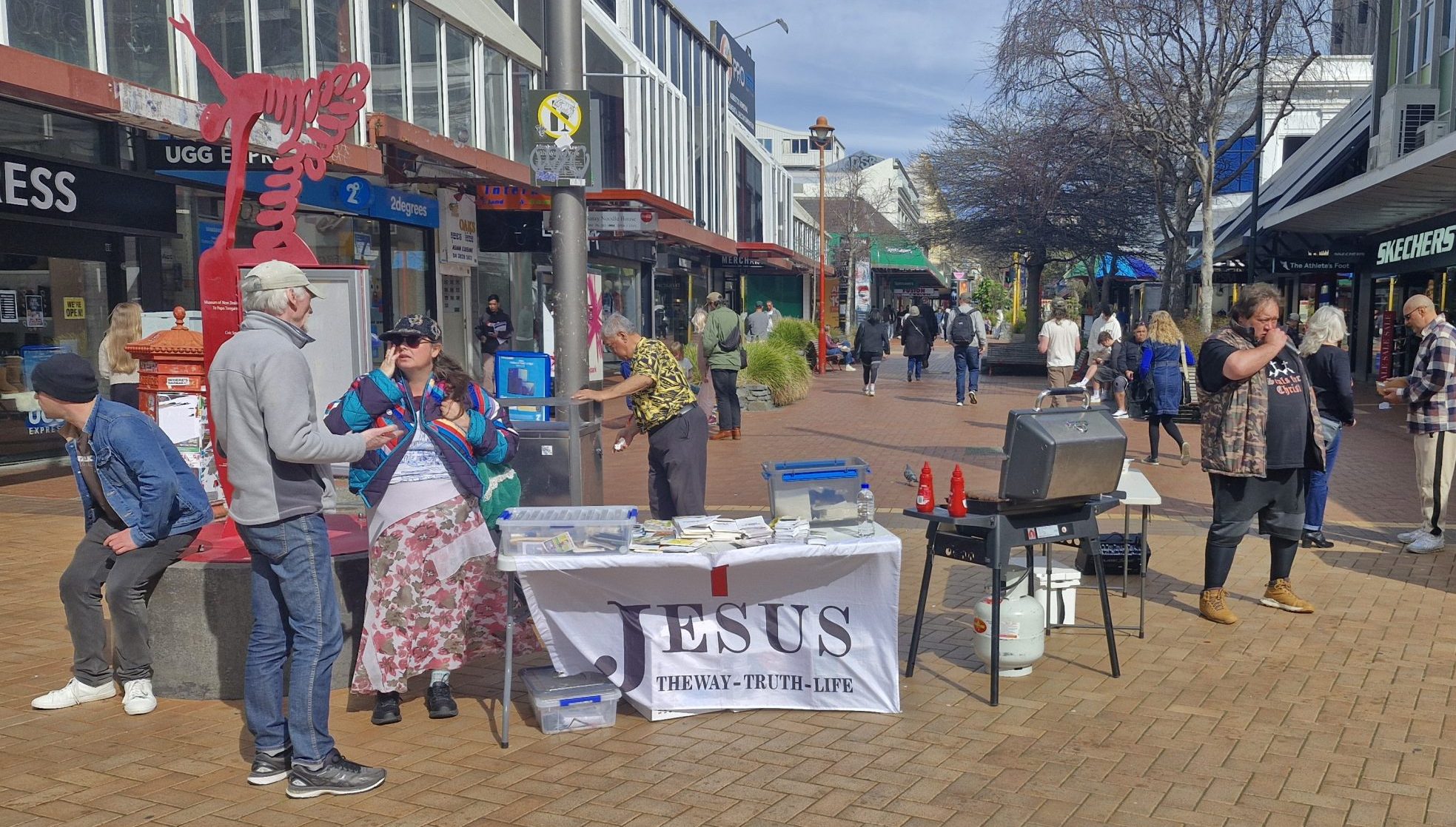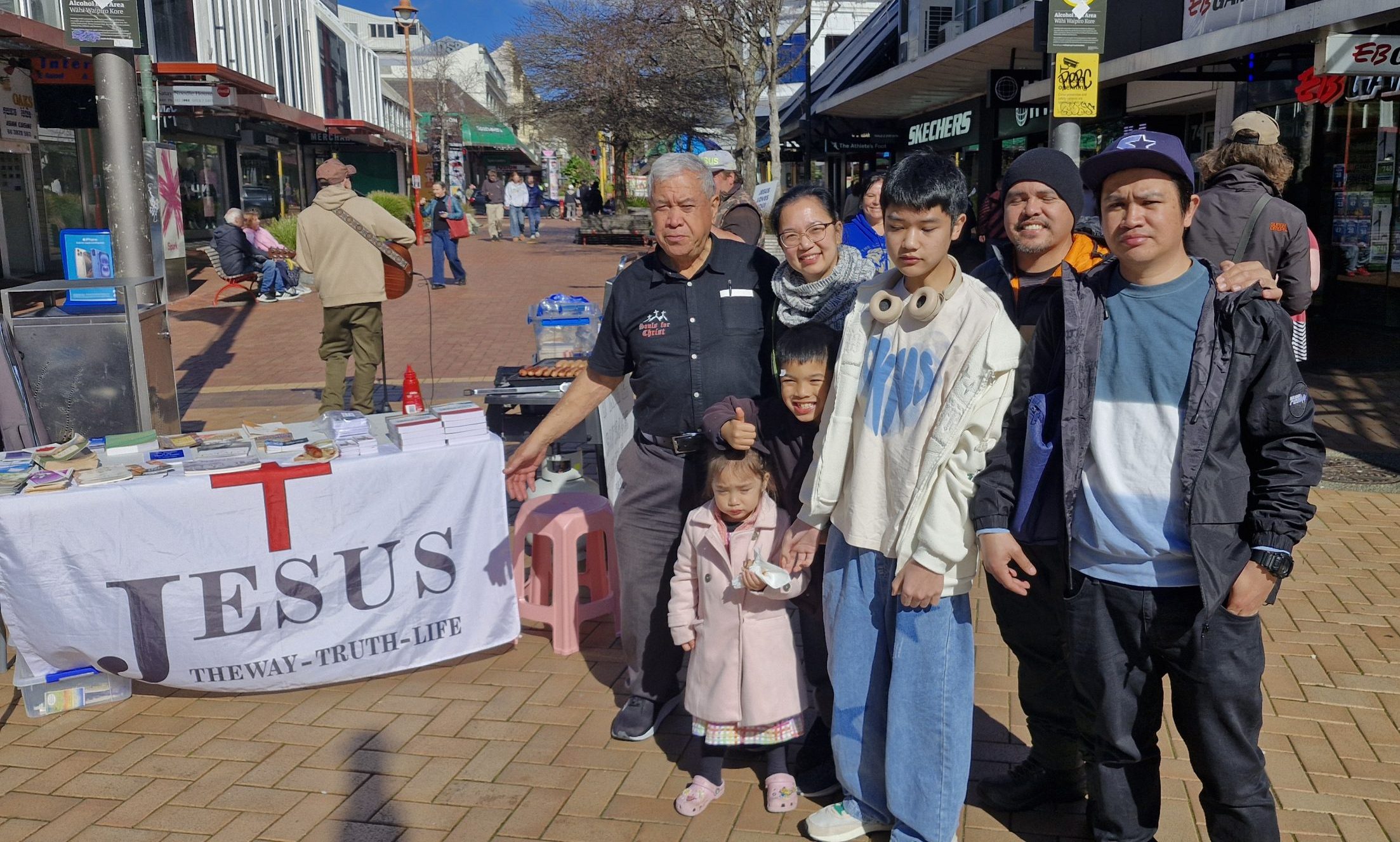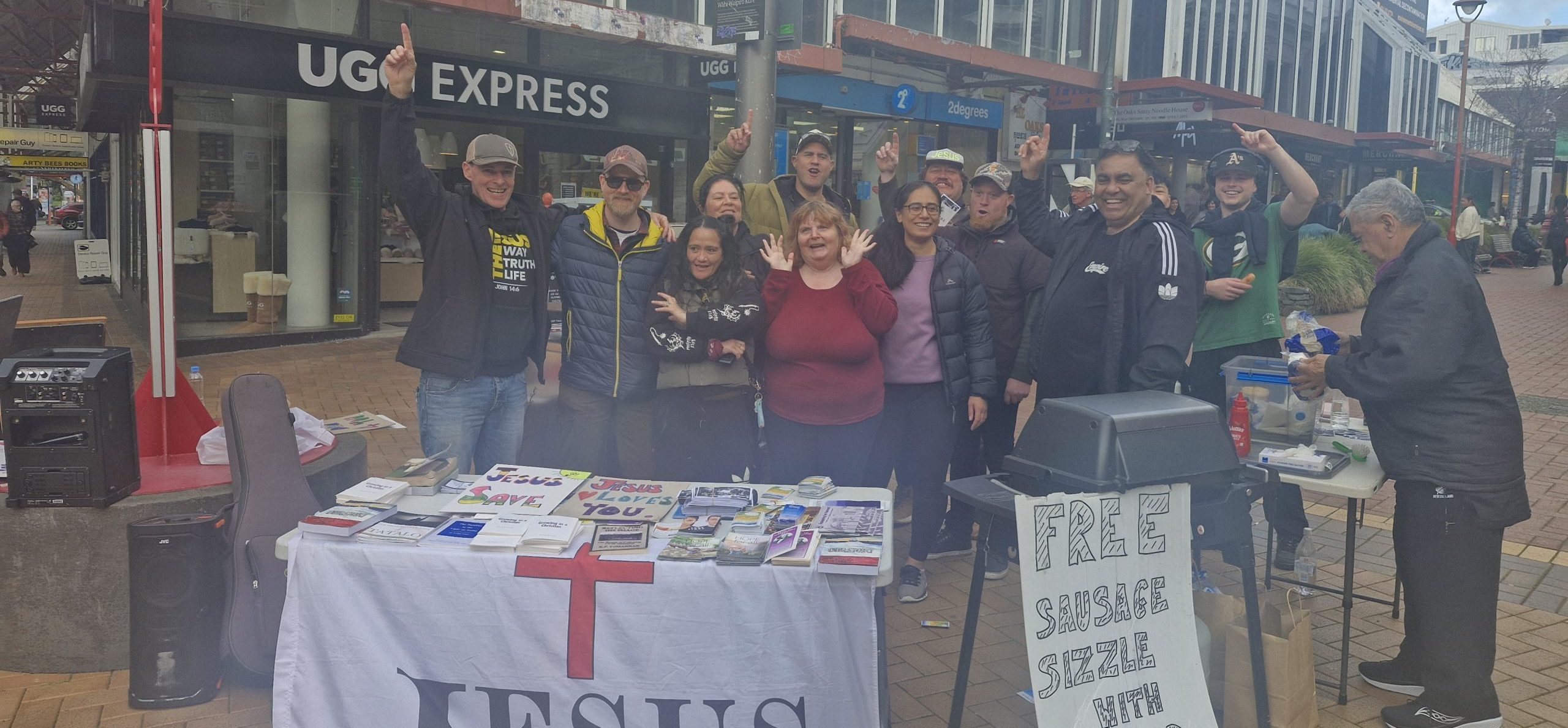 The sun was out with a little “Wellington” wind. We set up the tables with free drinks, bibles and a sausage sizzle for the public.